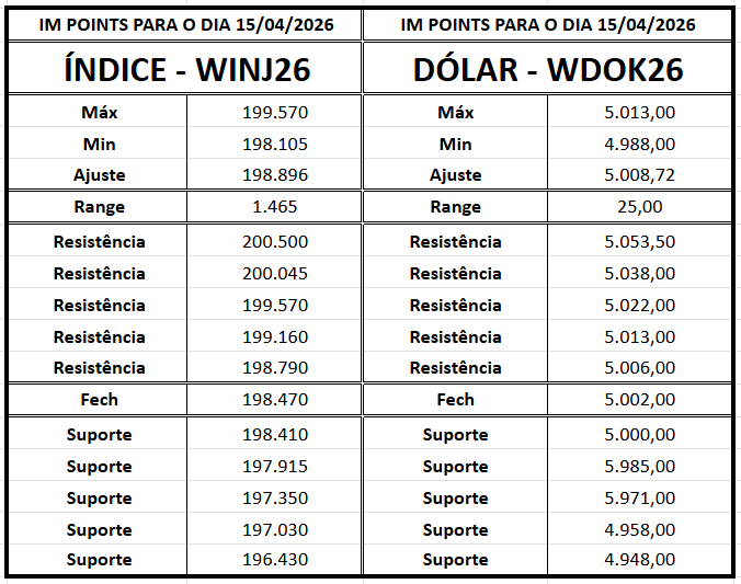 Por outro lado, o sinal de enfraquecimento passa pela perda da faixa de suporte em 198.000/196.175 pontos. Caso esse nível seja rompido, pode haver intensificação do fluxo vendedor, com alvos em 194.230/192.780 pontos e projeções mais longas na região de 189.240/186.280 pontos.